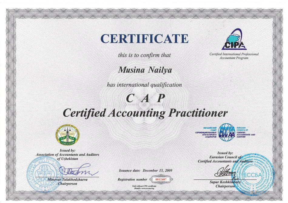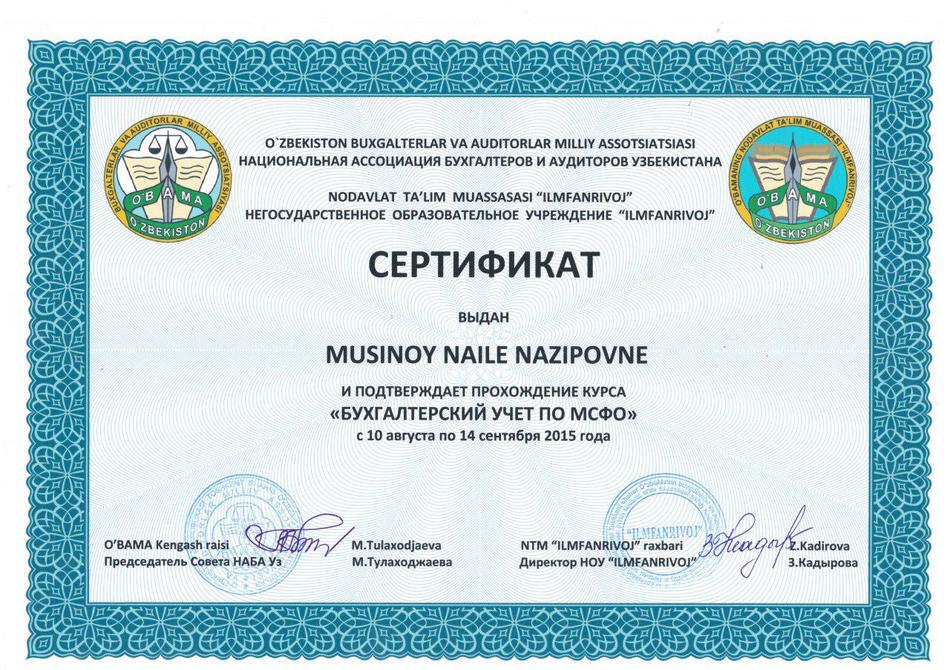 Сертификаты: Квалификационный сертификат аудитора №05318 от 11.07.2015г. Сертифицированный бухгалтер практик (САР)