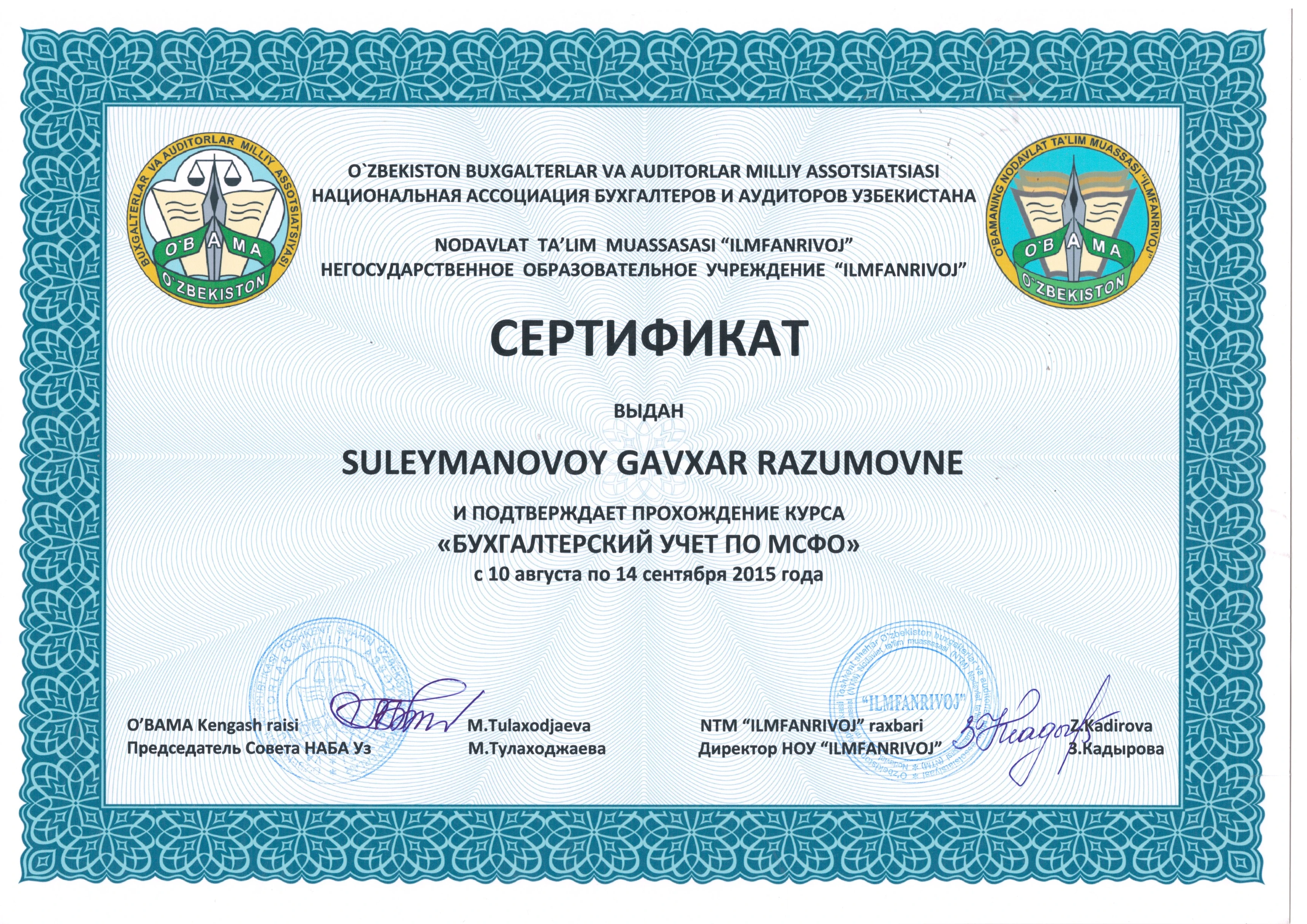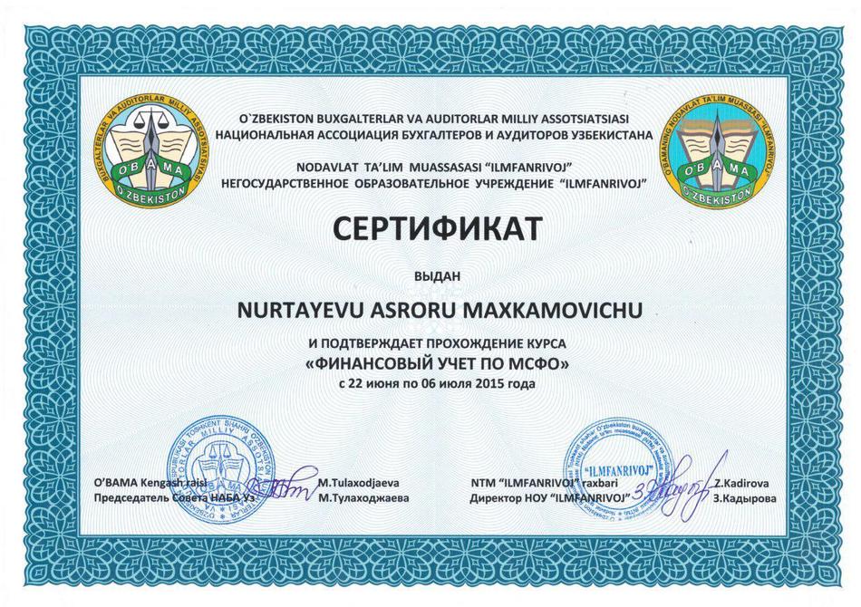 Сертификат о прохождения курса «Бухгалтерский учет по МСФО»