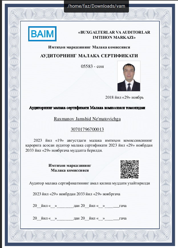 Сертификаты: Квалификационный сертификат аудитора №06271 от 19.11.2023 г.